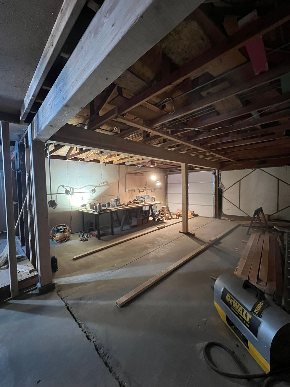 The client is relocating to Lakeside and transforming this old garage into a workspace for his sign business. Originally built in the 1940s using railroad ties, the structure was as close to beyond repair as it gets — with significant rot and a badly shifted foundation.